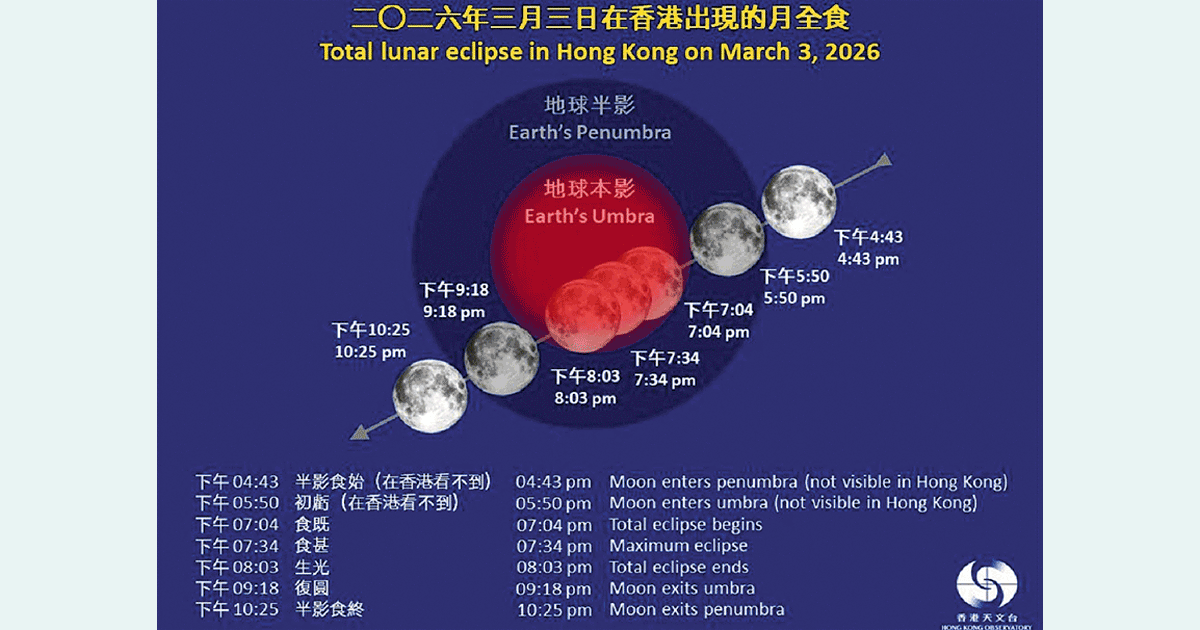 下月3日為農曆正月十五元宵節,又稱中國情人節,天文台表示當日傍晚香港上空將出現月全食天文現象【圖】,若天氣許可 ...全文