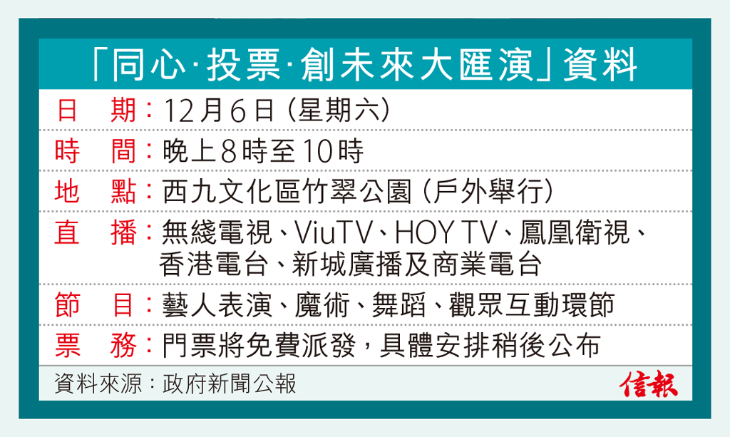 立法會換屆選舉將在12月7日星期日投票,而在投票前一晚、即12月6日星期六晚上8時,政府將舉辦名為「同心.投票 ...全文