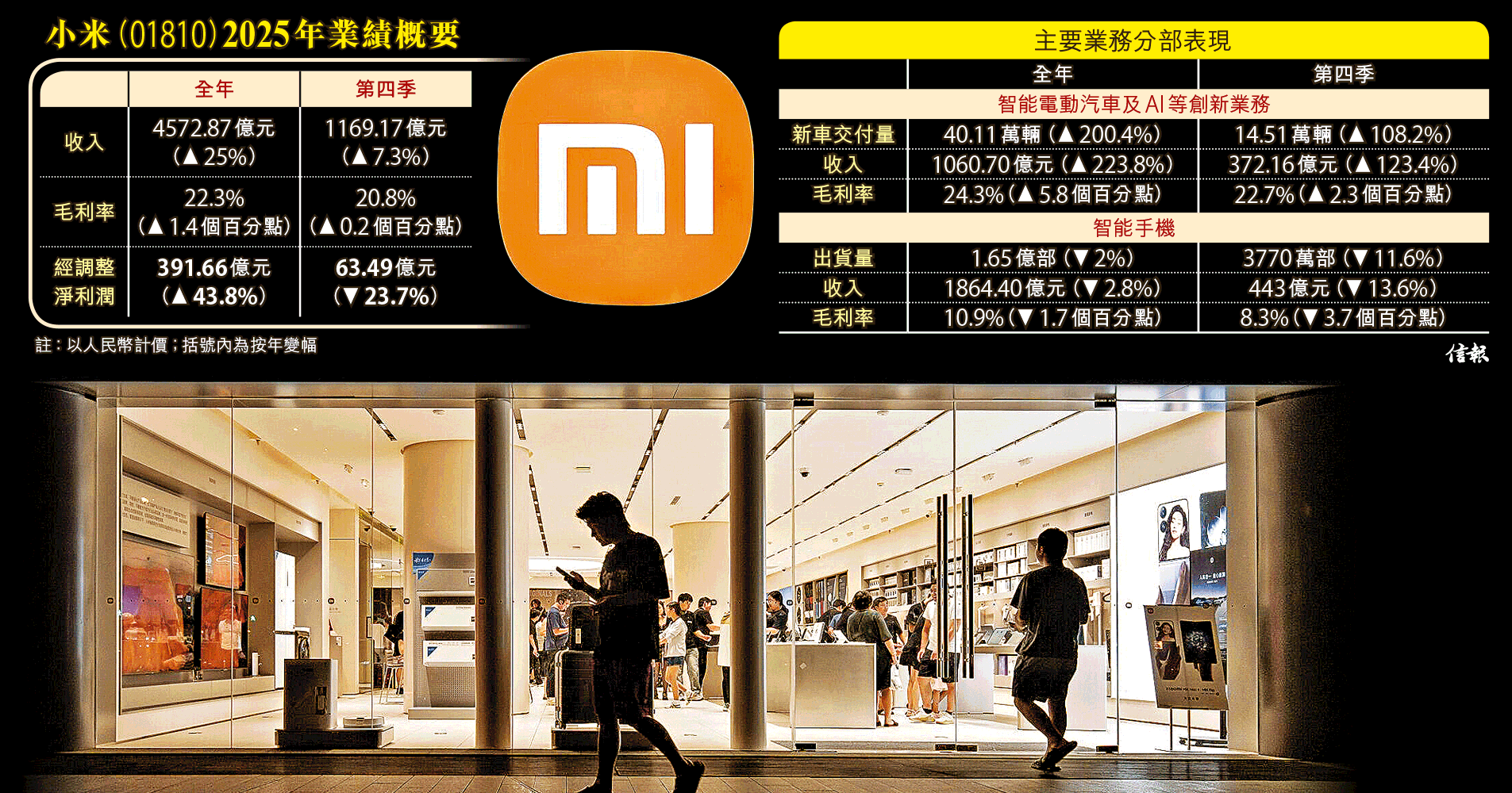 小米(01810)昨日收市後公布去年業績,儘管作為其主業的手機業務收入、毛利及出貨量均全線倒退,但在汽車業務增 ...全文