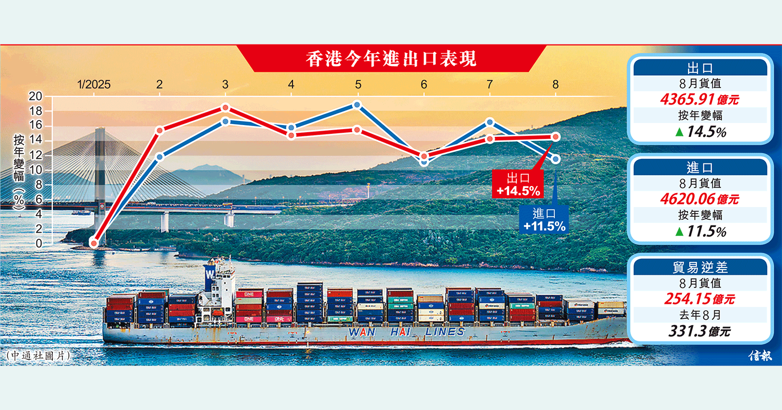 本港8月出口表現好過市場預期,政府統計處公布,8月商品整體出口貨值4365.91億元,按年上升14.5%,漲幅 ...全文