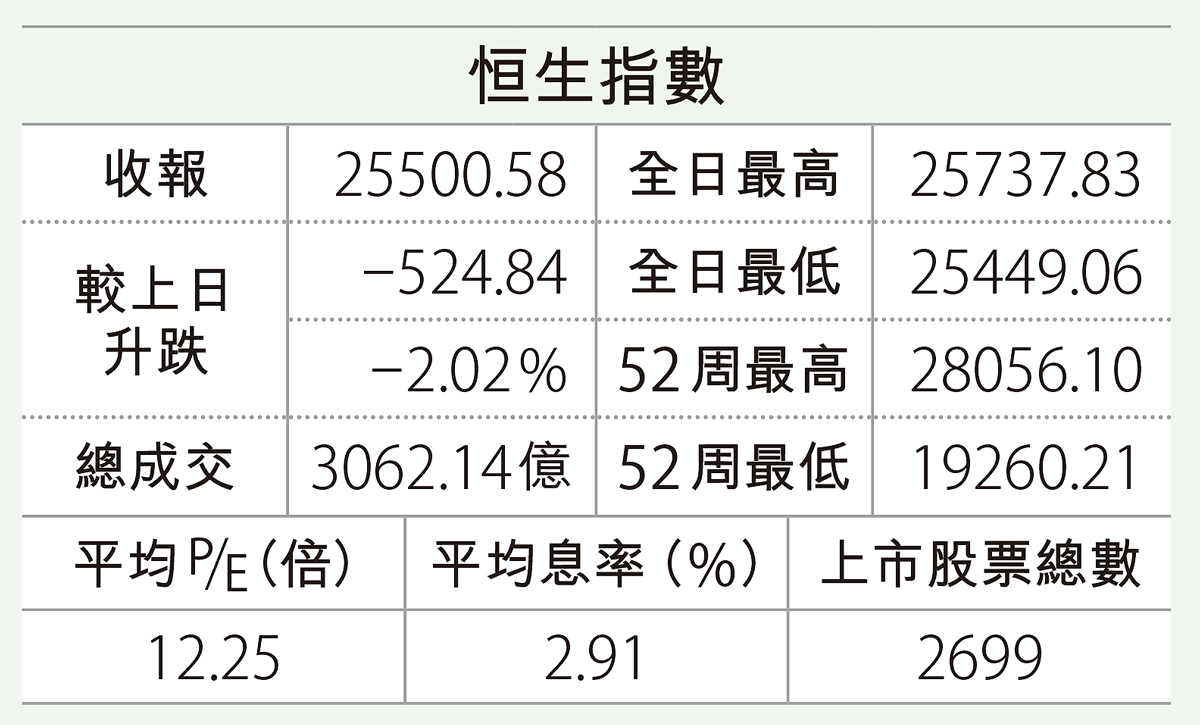 ... 環球股市進一步下滑,港股亦捱沽。昨日恒生指數低開474點,盤中最多跌576點至25449低位,收市跌524點或 ...全文