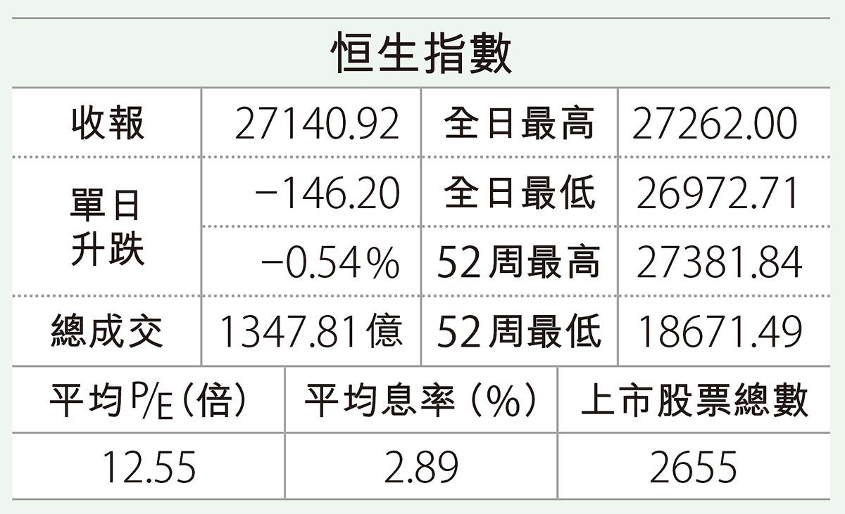 ... 指尾市逐步收復失地,收市跌146點(0.5%),收報27140點。 恒指夜期收報27153,跌28點,高水12 ...全文