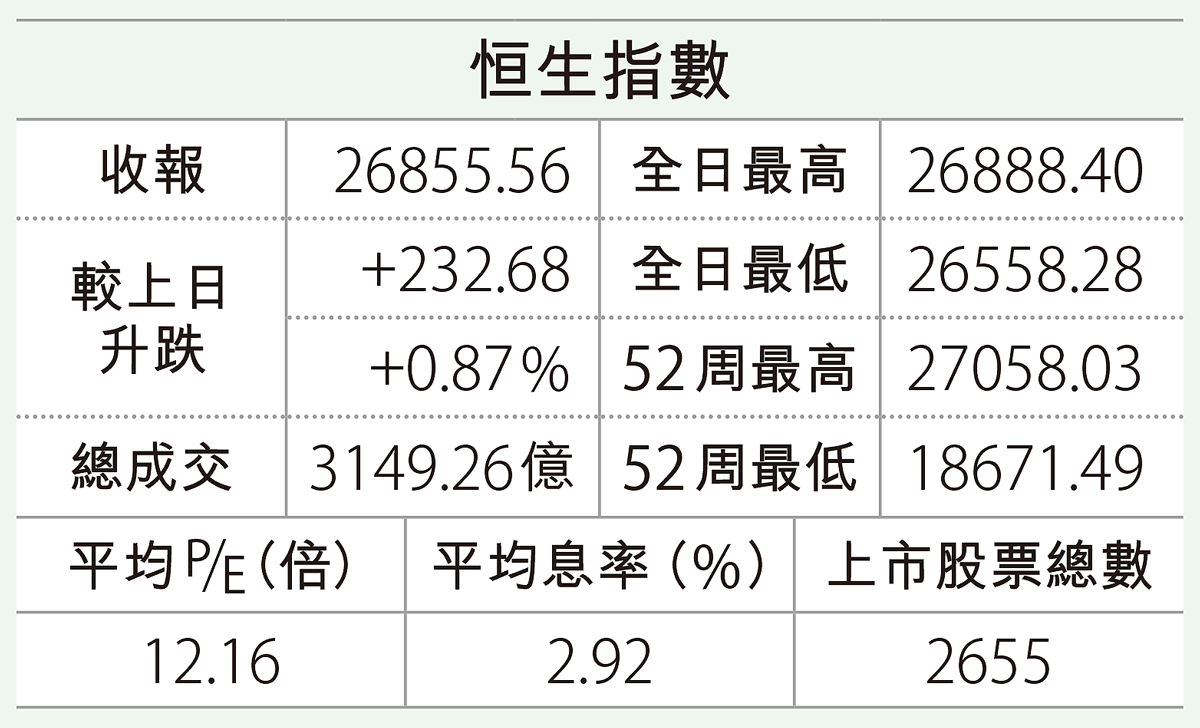 ... 倒升並拾級而上,最終收市漲232點(0.9%),收報26855點。 恒指昨漲232 北水淨吸155億 恒指夜 ...全文