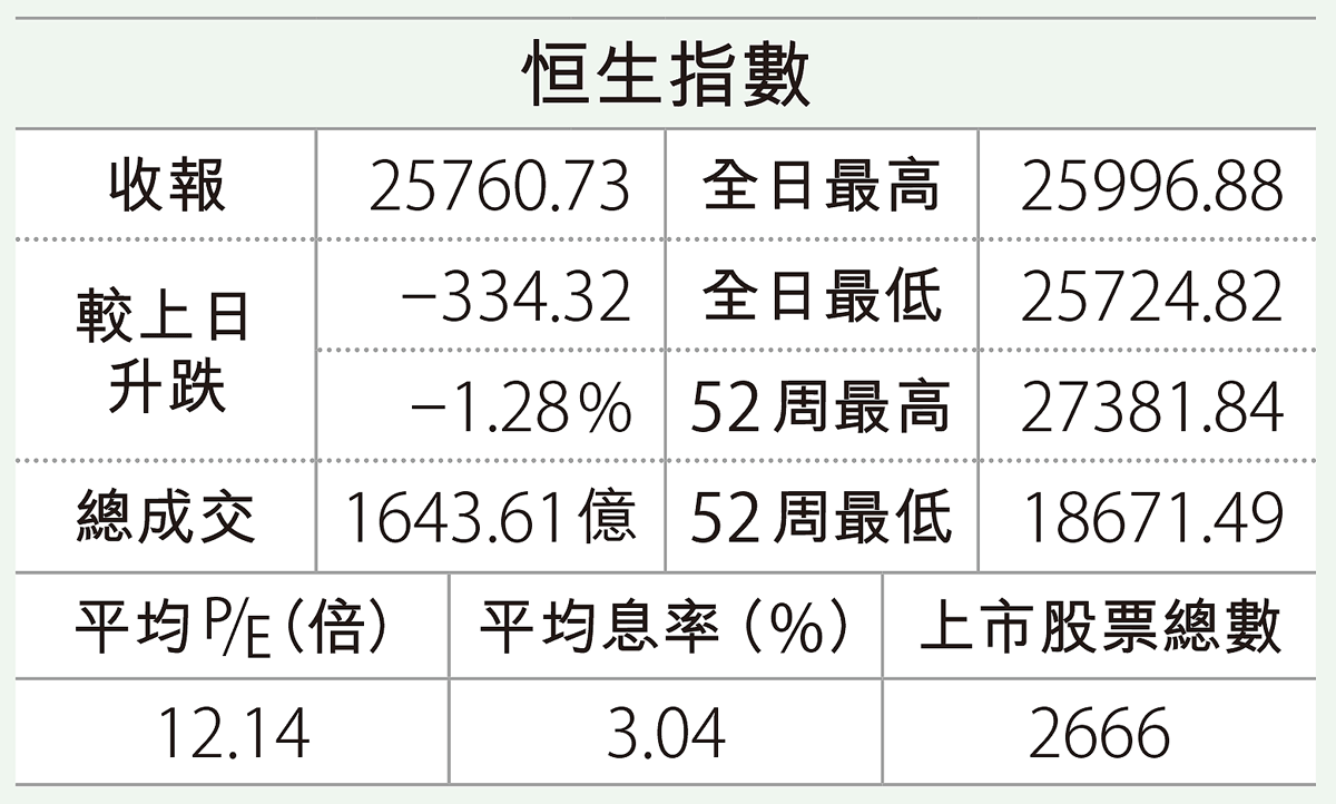 恒指昨表現疲弱,低開114點後跌幅擴大,曾瀉370點,之後反彈乏力,收報25760點,挫334點,大市全日成交 ...全文