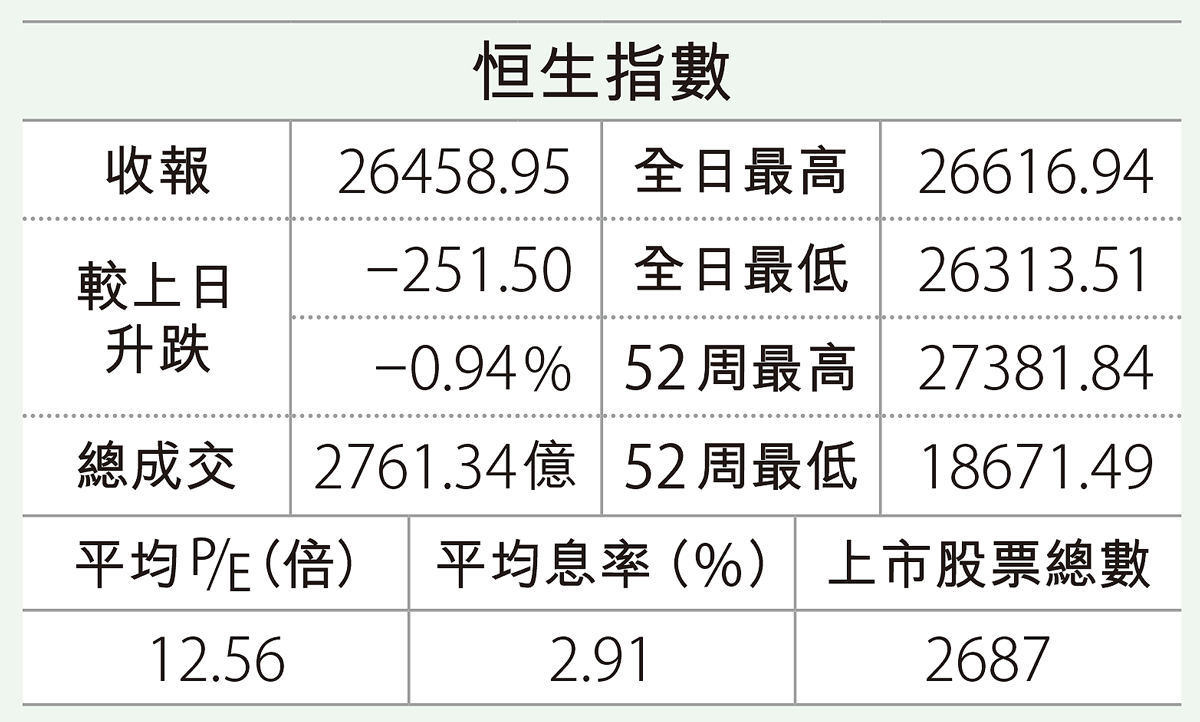 ... 低水111點;ADR港股比例指數收報26170點,較恒指本港收市低289點。