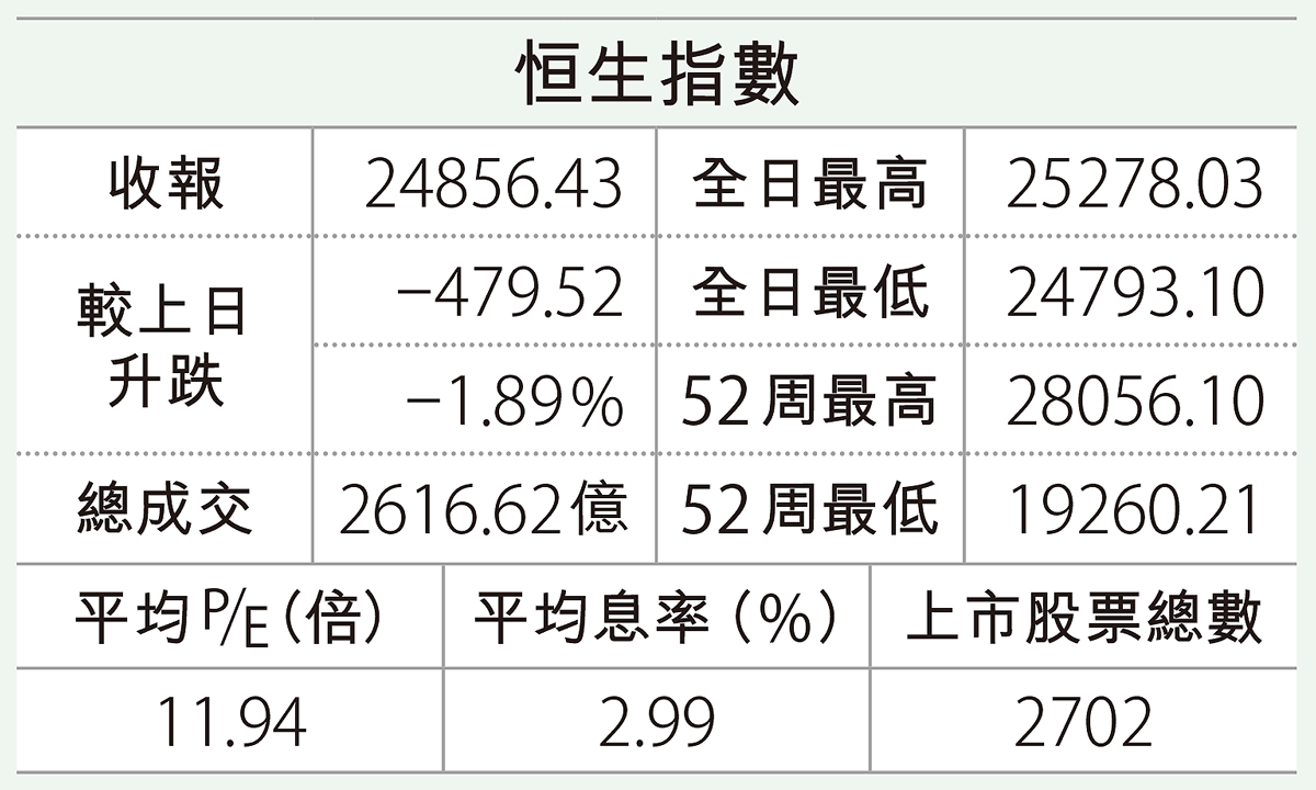 港股反彈兩日後壓力復現,恒指昨日由頭跌到尾,收市報24856,急挫479點,再一次跌穿大型橫行區底部25000 ...全文