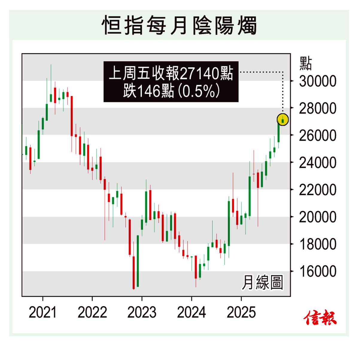 上周港股低點為周一26321點,高點升至周三的27381點,以27140點收市,比前周急漲1013點。