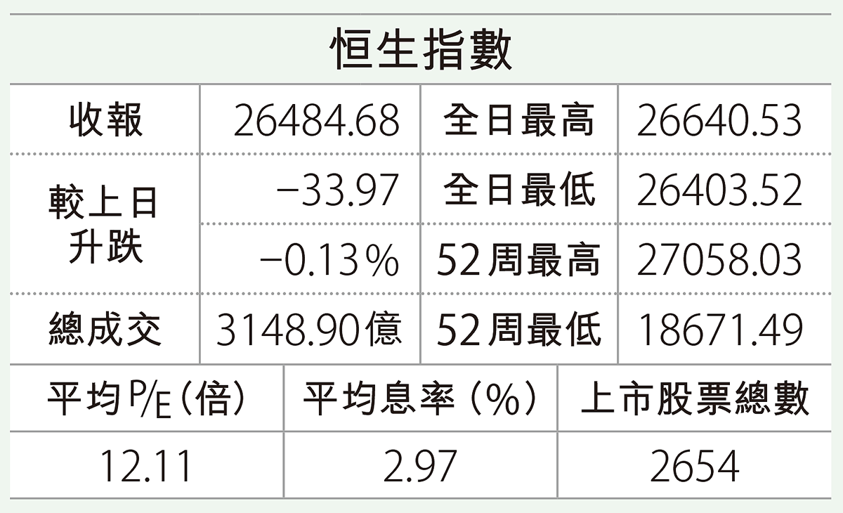 恒指夜市期指收報26372點,跌163點,較昨日恒指收市26484點,低水113點,成交22016張。