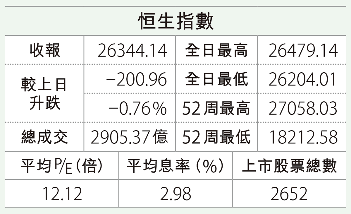 港股昨在科技股帶動下回吐,恒指低開85點後跌幅擴大,午後曾挫341點,收市跌幅收窄至200點,報26344點, ...全文
