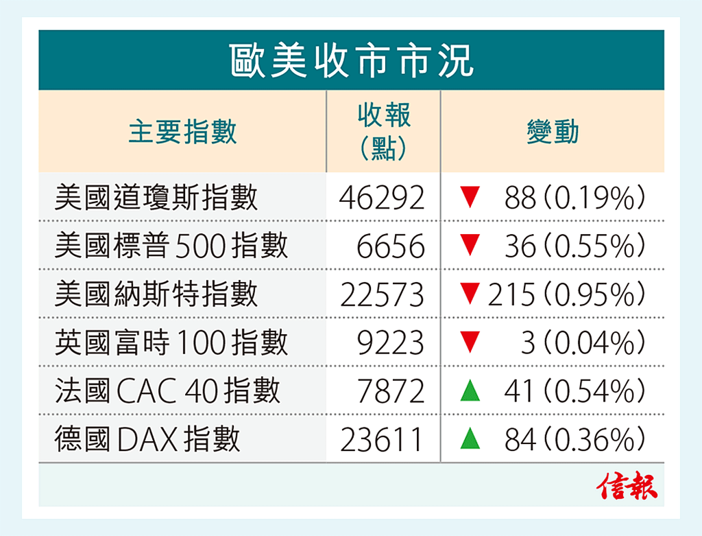 ... ,納指挫0.95%。歐股收市個別發展,法、德股分別揚0.54%、0.36%,英股跌0.04%。