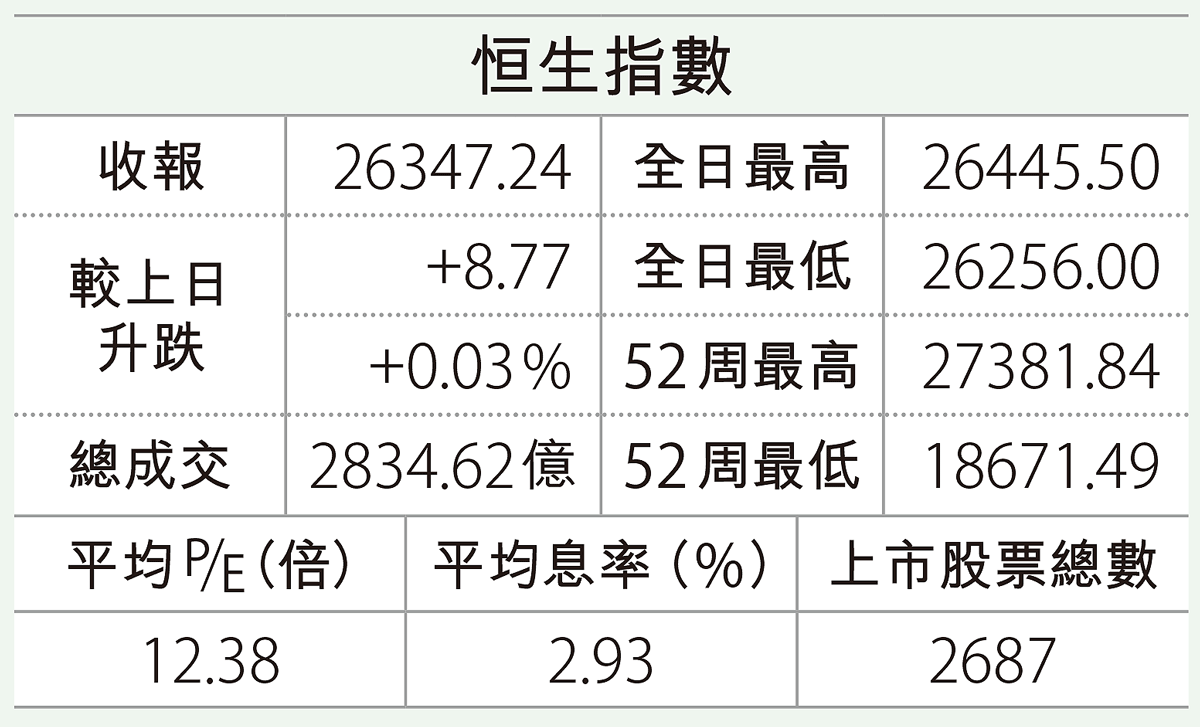 A股連續兩日上揚,港股延續強勢,甫開市即重上26500點水平,升幅一度擴大至逾500點,半日以貼近高位收市,升 ...全文