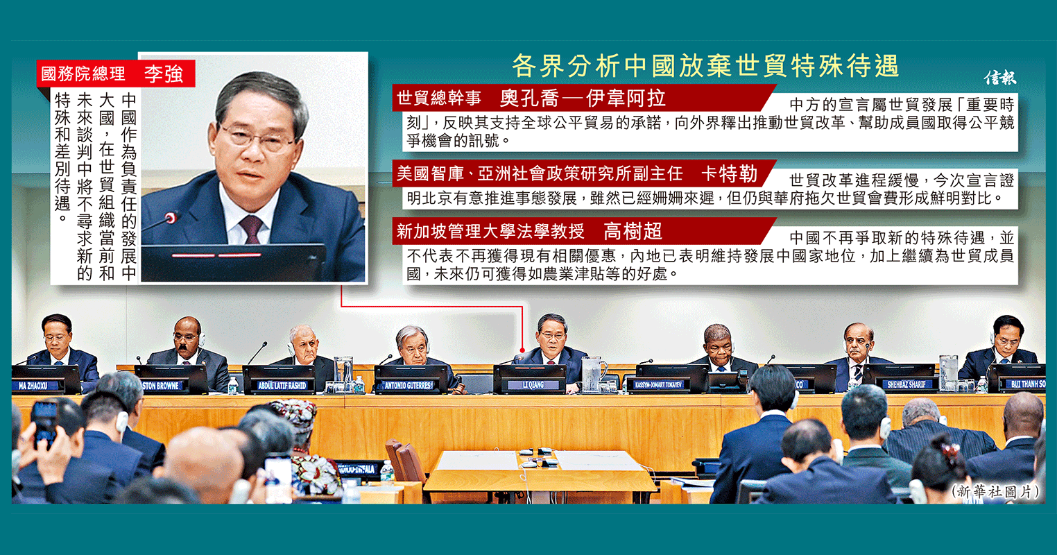 中國國務院總理李強宣布,中國作為負責任的發展中國家,在世貿組織當前和未來談判中,將不尋求新的特殊和差別待遇」相 ...全文