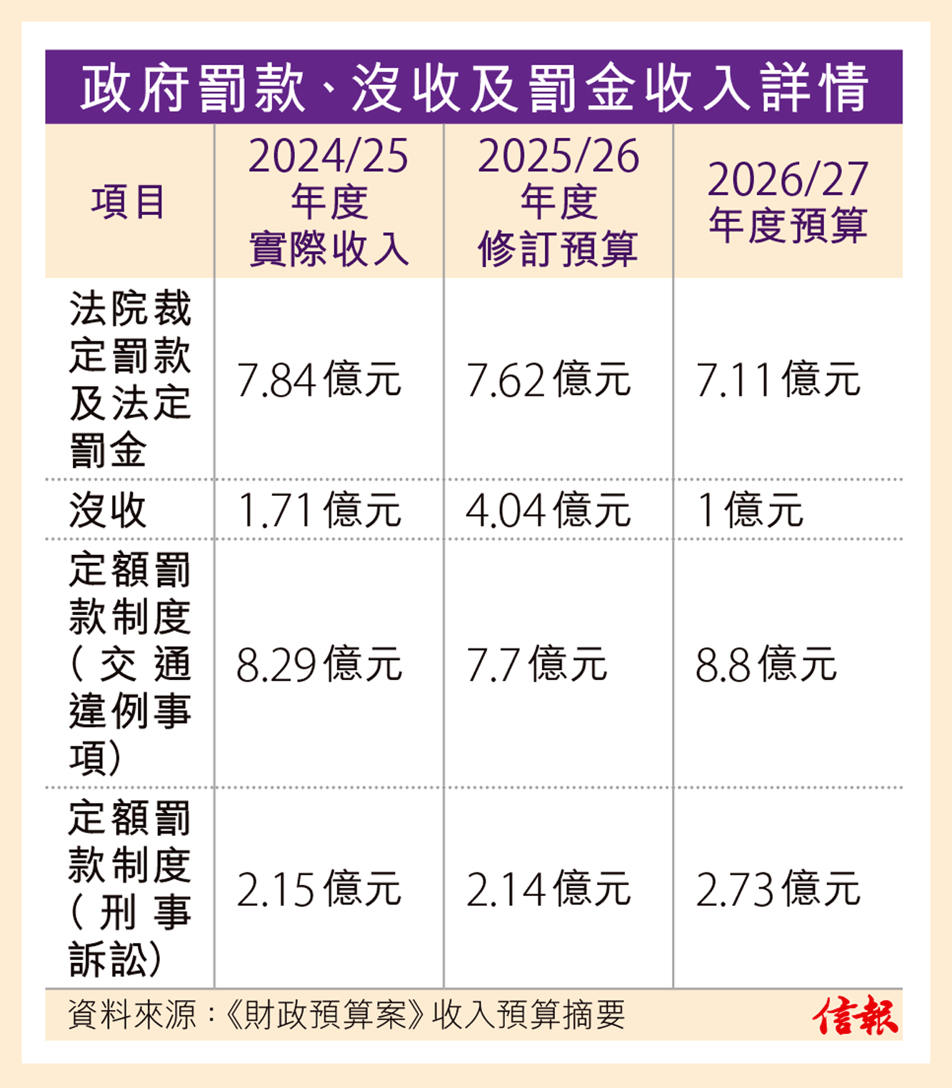 ... 年度俗稱「牛肉乾」的交通違例事項定額罰款收入,修訂預算為7.7億元,比上年度減少約6000萬元,但預計2026 ...全文