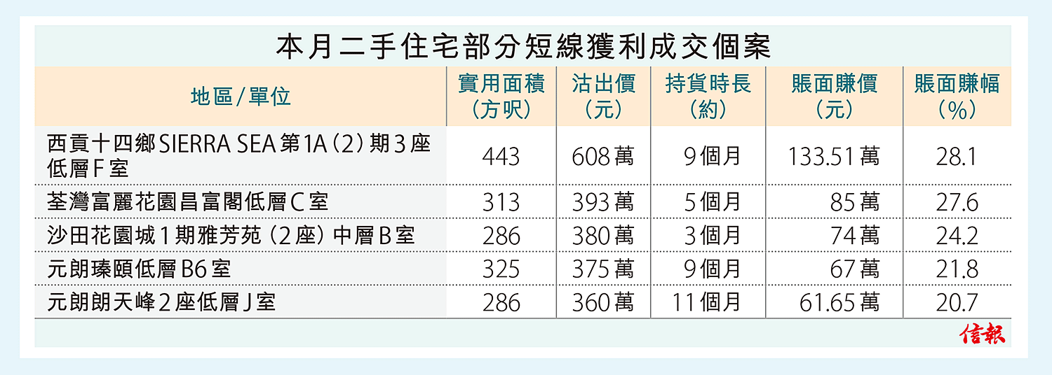 ... 市氣氛確有改善。綜合土地註冊處資料所得,今年11月全港2589宗已知上手購入價的二手私宅買賣登記中,賬面獲利個 ...全文