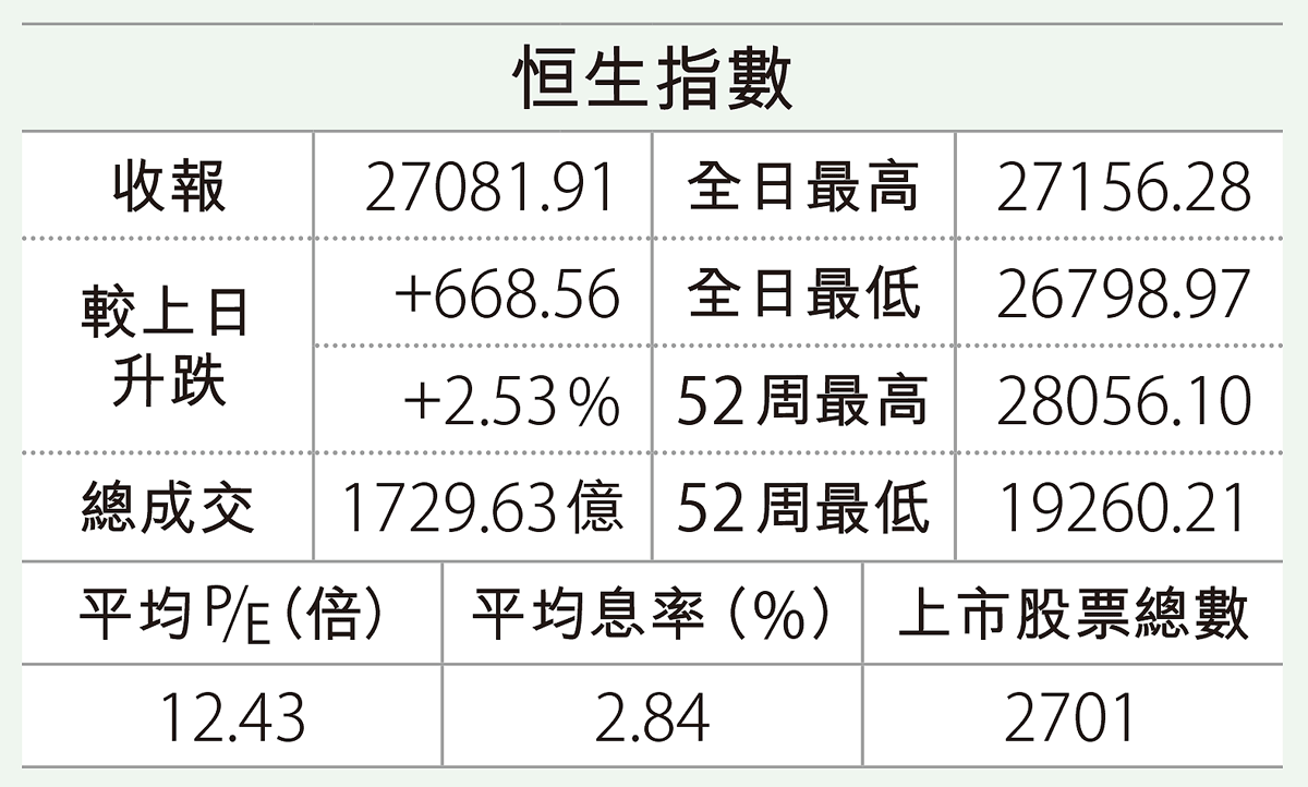 ... 盤再度湧現,恒指全日收市升668點,收報27081點,大市全日成交總額1729億元。 滙控有動力 恒地強勢 恒 ...全文