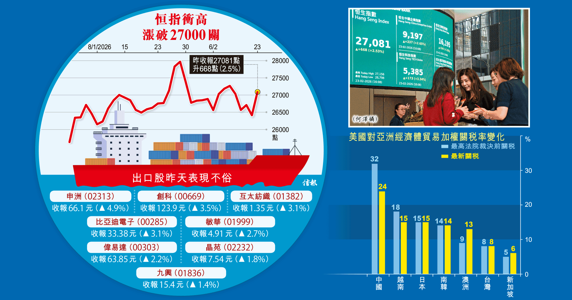 特朗普的關稅政策遭受重大挫折,刺激港股昨日急漲,恒指最多曾飆742點,至27156點,收市報27081點,大升 ...全文