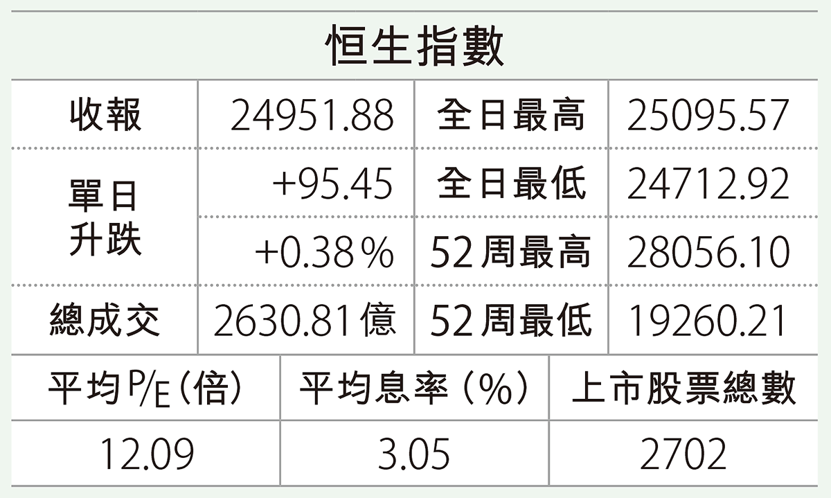 ... 後逐步回吐升幅,最終收市僅揚95點(0.4%),收報24951點,二萬五關得而復失。 恒指夜期續受壓,收市報 ...全文