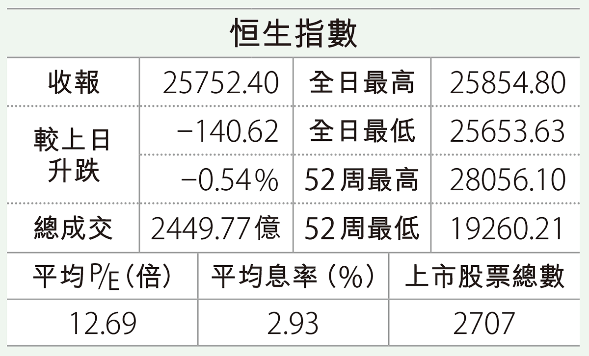 ... 後沽壓再度加劇,最終收市挫140點(0.5%),收報25752點。國指昨失65點(0.8%),收報8611點; ...全文