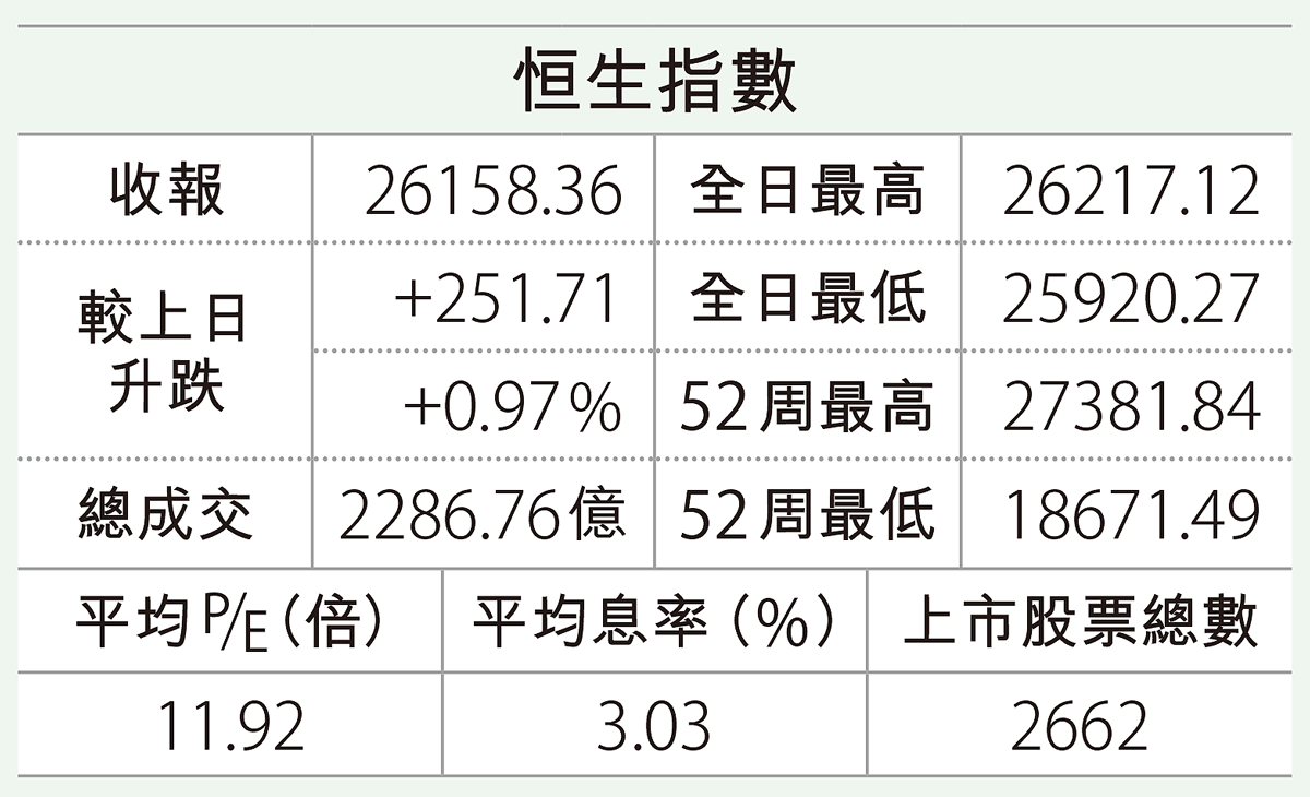 1.港股11月開局升251點重越兩萬六 暫受制20天線