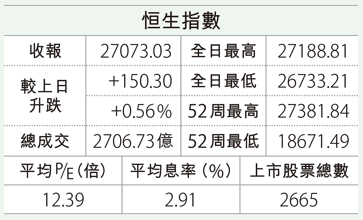 港股昨日先跌後升,恒指低開後一度下跌189點,午後表演拗腰神技,抽高至27188點,倒升266點,收市報270 ...全文