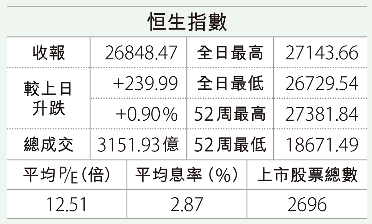 港股承接外圍強勢,恒指今日造好,在初段一度升逾500點、重越兩萬七關口,惟高位遇阻,升幅逐步縮水,全日升幅最終 ...全文