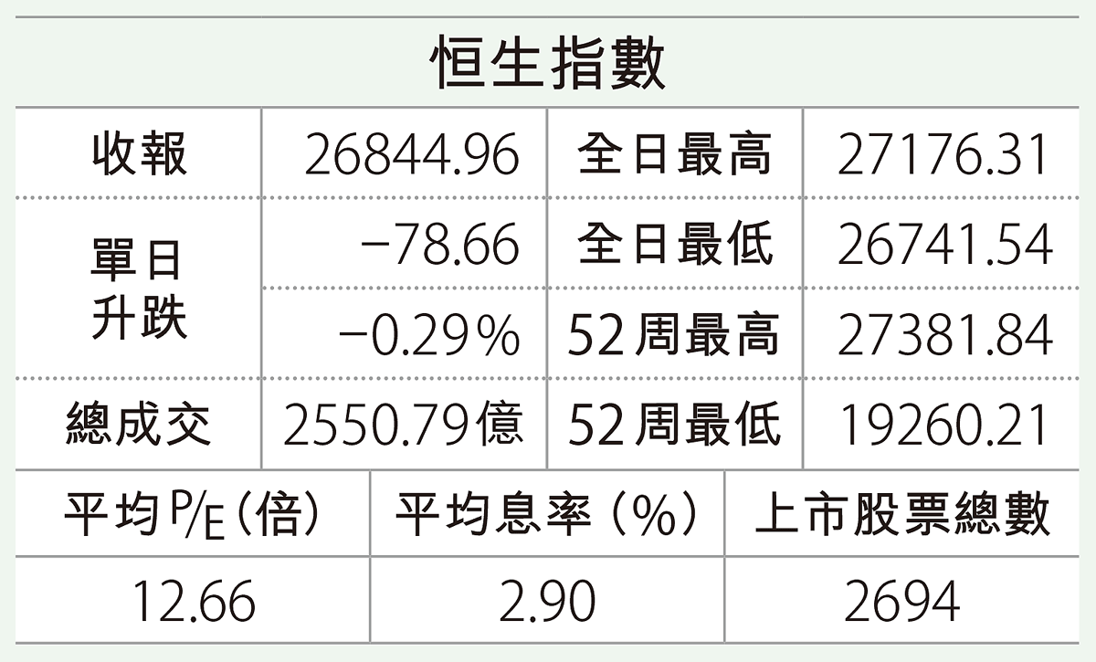 港股昨日回氣後再度挑戰兩萬七關口,惟大市高開低走,早段升逾200點後升幅全數蒸發並倒跌,恒指全日埋單跌78點, ...全文