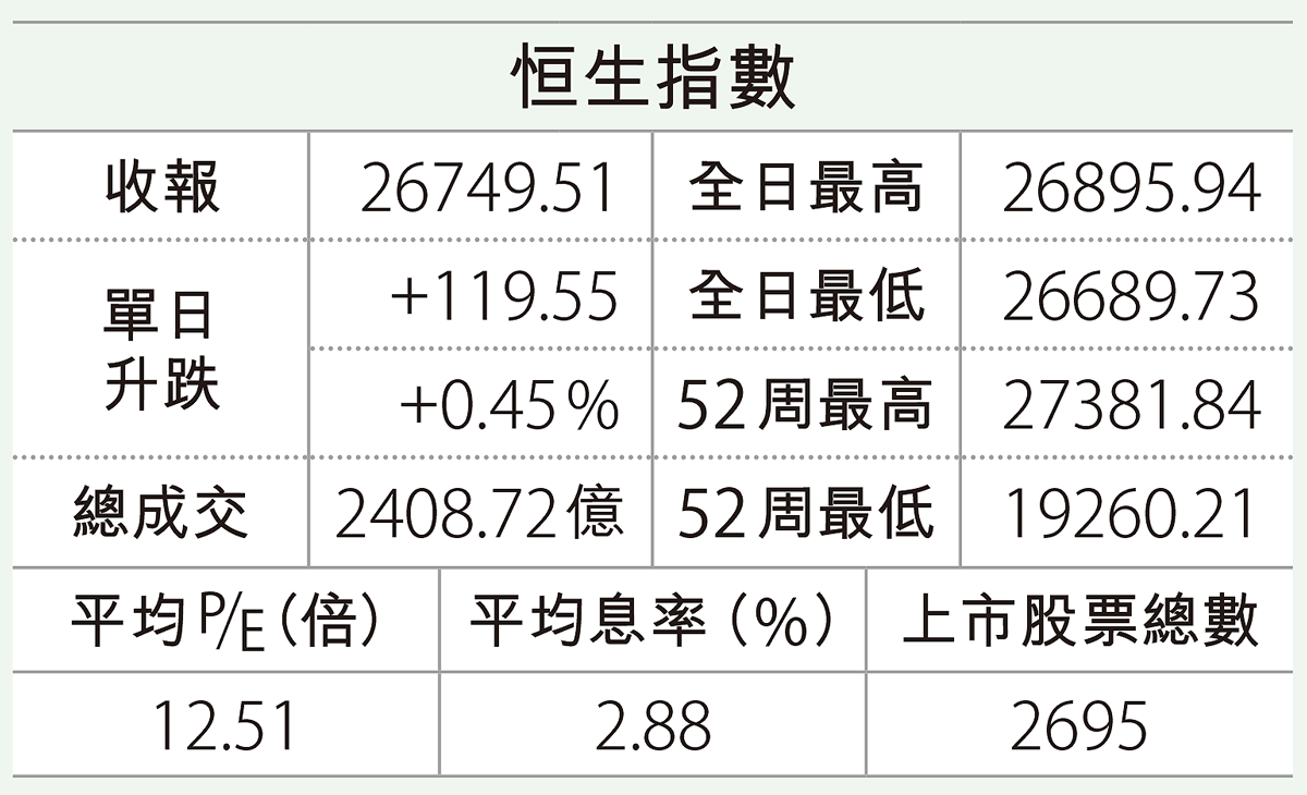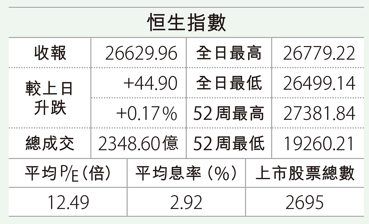 ... 爾街造成壓力。 返回港股,周五恒指高開231點,全日在26689點至26895點區間爭持,收報26749點,升 ...全文
