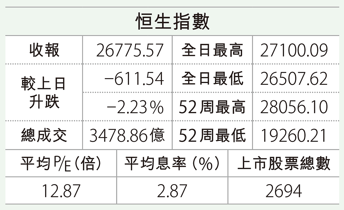 港股昨日大幅下挫,恒指收報26775,勁跌611點,兩個交易日累跌近1200點。大市短線調整已在意料之中,但跌 ...全文