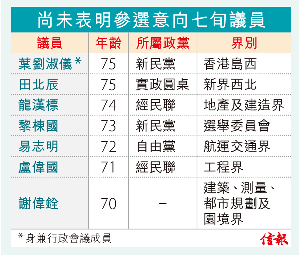... 北辰;經民聯龍漢標及盧偉國;自由黨易志明及G19謝偉銓。葉劉淑儀日前向傳媒表明不相信存在「70歲大限」,認為「 ...全文