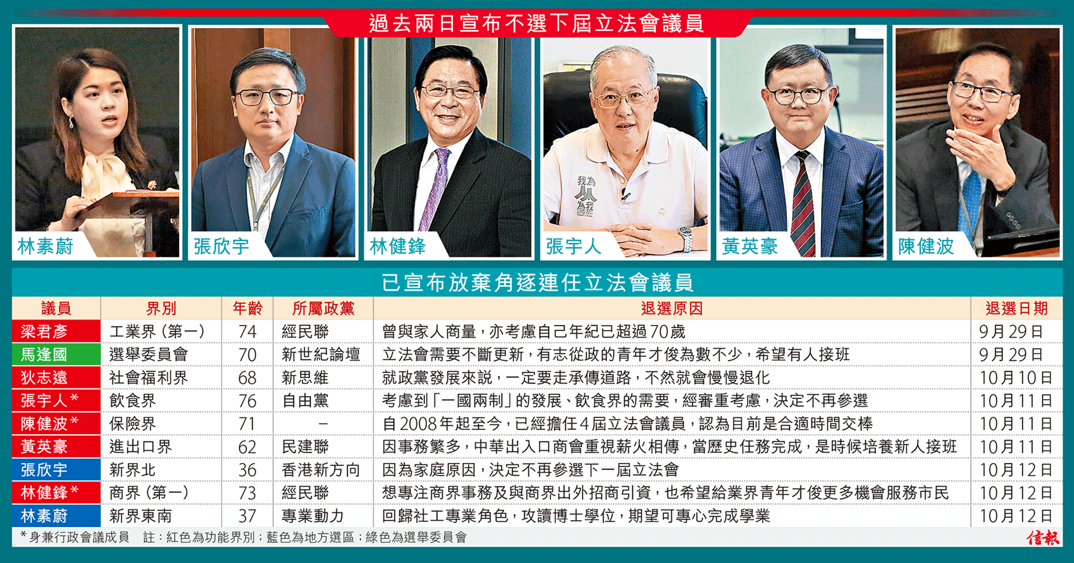 立法會選舉提名期於本月24日開始,目前已有多名年過70歲的立法會議員宣布不參選立法會,包括身兼行會成員的張宇人 ...全文