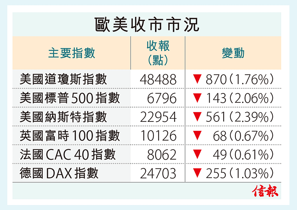... 99點或1.43%;納指報23096點,跌413點或1.76%。