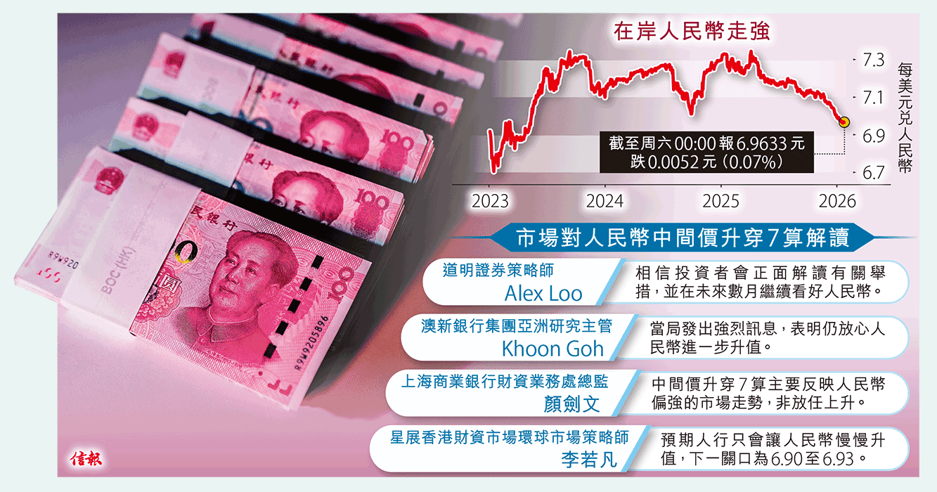 人民幣兌每美元中間價周五(23日)升穿7算關口,為逾兩年半以來首次,有解讀認為人民銀行準備容忍人民幣進一步升值 ...全文