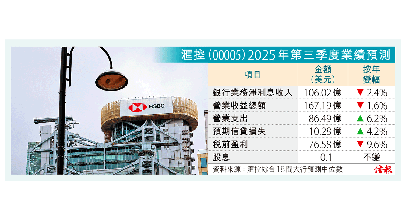 滙控(00005)明天公布第三季度業績,該行綜合18間大行預測,季度稅前盈利料為76.58億美元,按年跌9.6 ...全文
