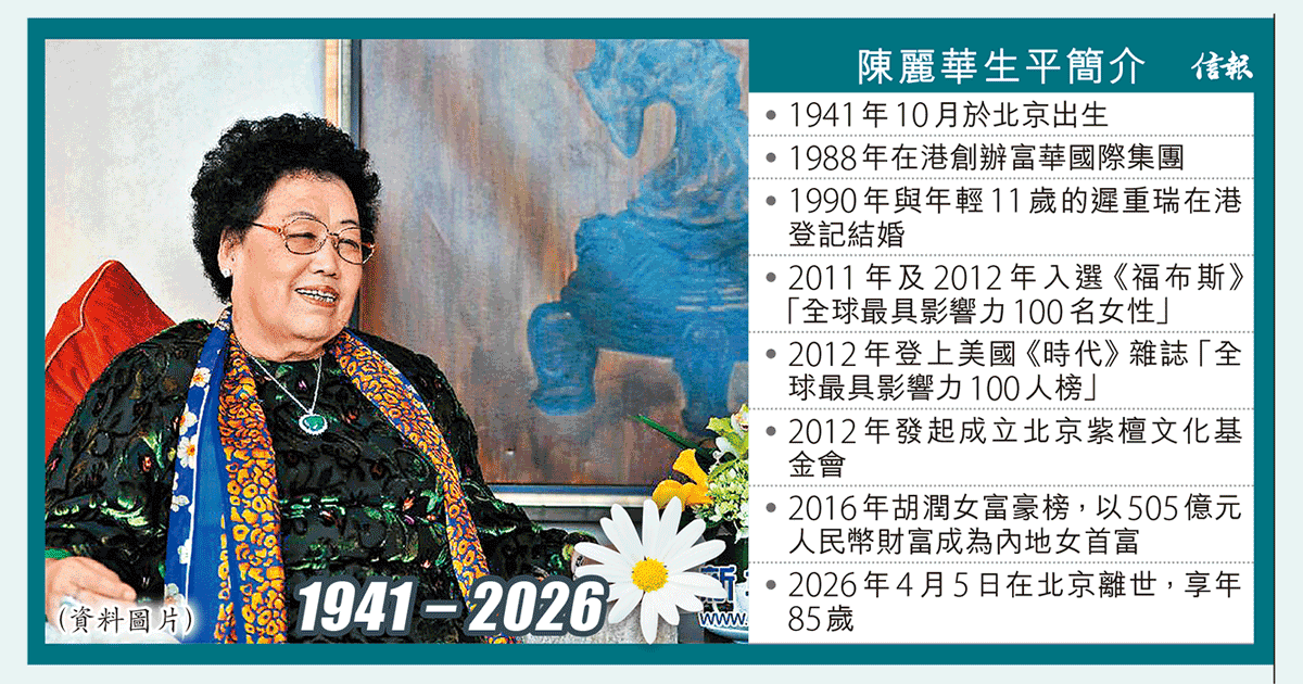 富華國際集團發布訃告稱,富華國際集團榮譽主席、中國紫檀博物館館長陳麗華,因病醫治無效,於2026年4月5日在北 ...全文