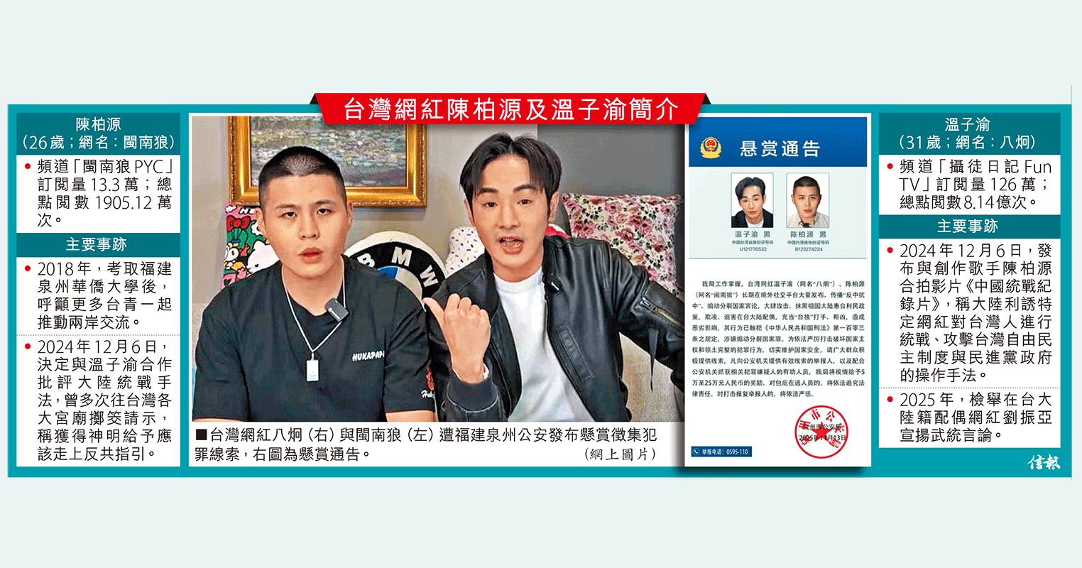 中國福建泉州公安局發布懸賞通告,徵集對台灣網紅「八炯」溫子渝及「閩南狼」陳柏源的違法犯罪線索,視情況給予5萬至 ...全文