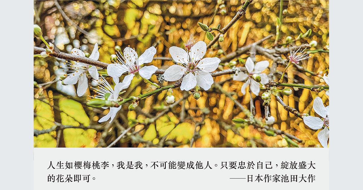 人生如櫻梅桃李,我是我,不可能變成他人。只要忠於自己,綻放盛大的花朵即可。──日本作家池田大作